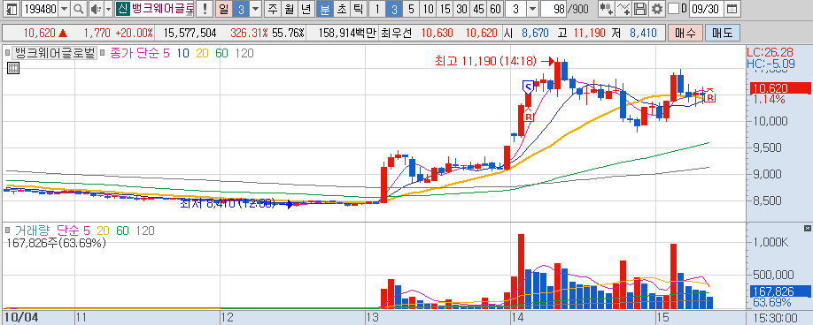 뱅크웨어글로벌 : STO 토큰 증권 관련 테마주, 1차 단타로 수익 발생 종목(+0.45%)