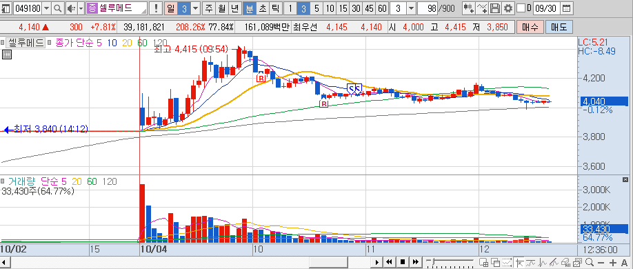 - 대응 : 셀루메드와 반대로 강한 상승에 올라타는 매매로 수익 발생, 조정 시점 한번 더 활용함. 급등 시 5일선 보다는 10일선 지지를 확인하고 매수 및 손절(10일선 완전 봉 이탈) 방법 향후 고려.