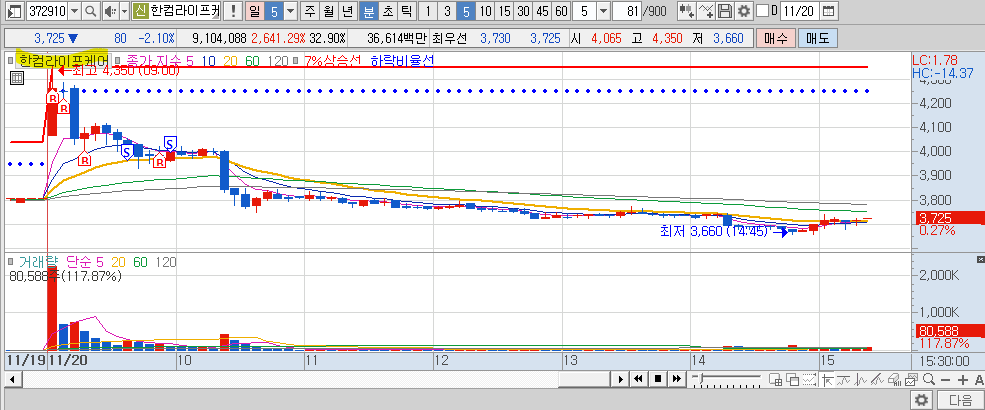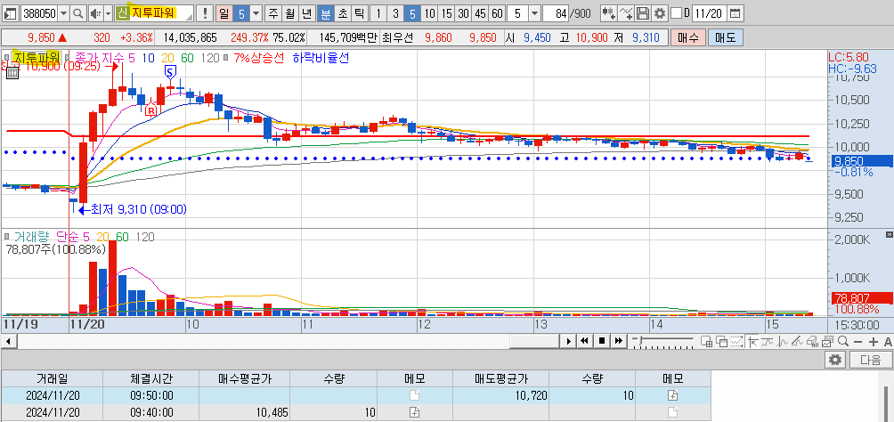 - 정리 : 거래량이 살아 있으면 5분봉선 지지 확인 후 재매수 진행(단, 10분 정도 정도 확인)