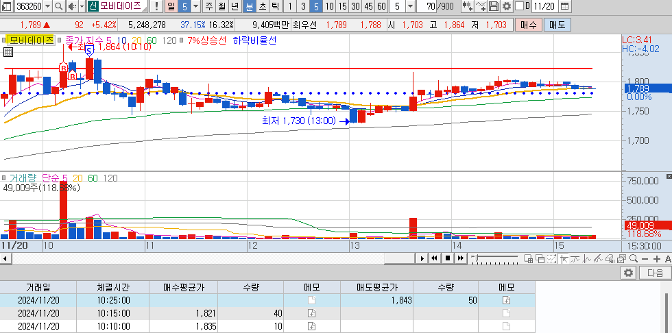 - 시나리오 : 3세대 온라인 광고 기업인 모비데이즈는 2021년 틱톡의 공식 파트너로 선정 이력 및 애드테크 기반 광고 효율화 역량을 인정받아 파트너십을 지속적으로 강화 등 트럼프 당선으로 틱톡 강세 예상 재료, 손절은 10분 봉선 종가 이탈.