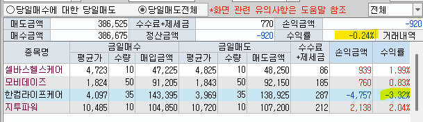 오늘은 매매 단위로 10배 키웠다는 데 의미가 있었다. 물론 미미한 손절로 인한 손실은 있었지만 나만의 매매 시스템을 구축해 가는데 배움이 있는 트레이딩이었다.