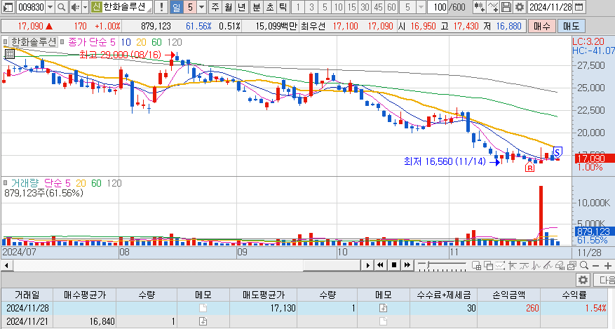 - 분석 : 회사와 종속기업의 사업은 연결실체의 사업부문별 특성에 따라 기초소재 부문(한화솔루션(주) 케미칼 부문, Hanwha Chemical (Ningbo) Co. Ltd 등)이 있음, 신재생에너지 부문(한화솔루션(주) 큐셀 부문, Hanwha Q CELLS Co.,Ltd, Q Energy 등), 가공소재 부문을 보유함. 오늘 기관 매수 유입 있었음. 좀 높은 가격대 매도를 했어야 했으나 예상보다 더 오리지 않아 당일 청산함. 매물대 지지는 받지만 너무 많은 매물대로 인해 큰 반등은 쉽지 않을 듯함.