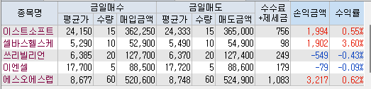아래는 오늘 단타 매매로 총 5 종목이다. 4 종목만 하기로 했는데... 이엔셀 매수하고 아차 5종목이네 하고 그냥 정리했다.