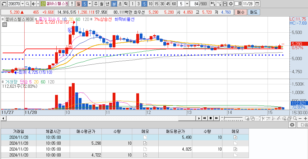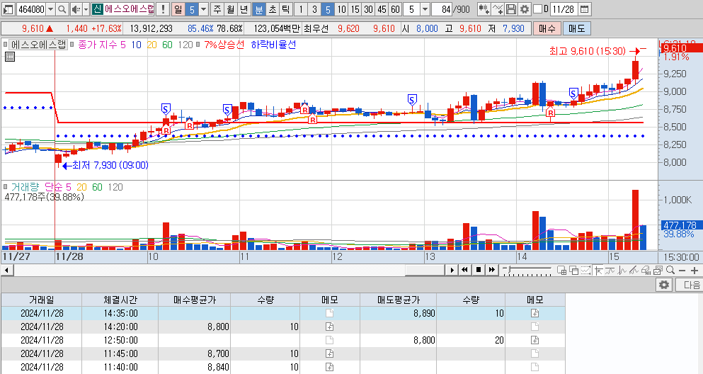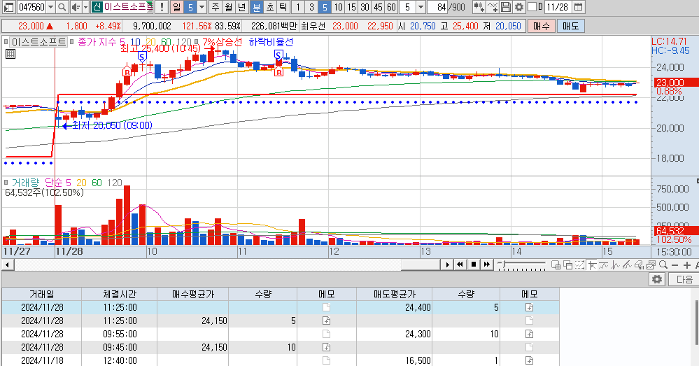 - 분석 : 인공지능(AI) 기반 희귀 유전질환 진단 기업, 향후 1년간 코트라의 지원을 받으며 미국 LA 지역을 중심으로 지사화 사업을 추진, 초반 프로그램 매수 전환 확인 후 진입하였으나 시나리오대로 가지 않아 손절, 이후 장 마감 시간대 매수세 유입 확인하고 진입하였으나 약한 상승으로 기대수익 1%는 못 갔고 결국 3:30분 장마감 시장가 매도.