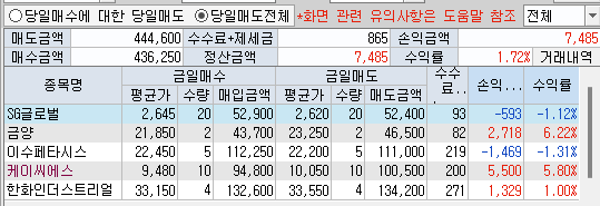 오늘은 수익 실현으로 마무리. 5 종목 거래함. 4 종목만 하고 마무리하려고 했으나 금양은 스윙 관점에서 매수하였으나 수익이 잘 올라와서 당일 수익 실현하고 종료함. 역시 선택과 집중 그리고 확률을 최대한 높이고 손절을 명확히 하는 것이 중요함을 느꼈다.