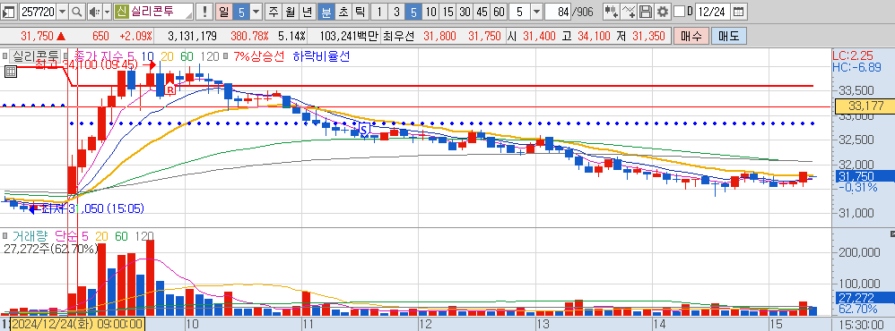 - 분석 : -3.61% 손실, 외국인 수급이 좋아서 진입, 20분 선 손절 목표로 잡고 이탈 후 반등 시 손절 시나리오, 하지만 반등 없이 쭈욱 하락하여 중간에 손절함. 그리고 반성할 점은 상승 재료(뉴스 등) 없는 상황에서 수급만 좋다고 선정한 점.