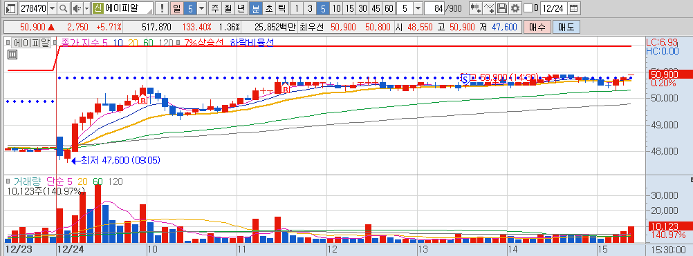 - 분석 : 한국콜마는 -1.4% 대 손실, 에이피알은 본전, 둘 다 "재료"가 약하고 타점도 상승 정도(추세 전환 확인)에 따라 기다릴 필요 있음.